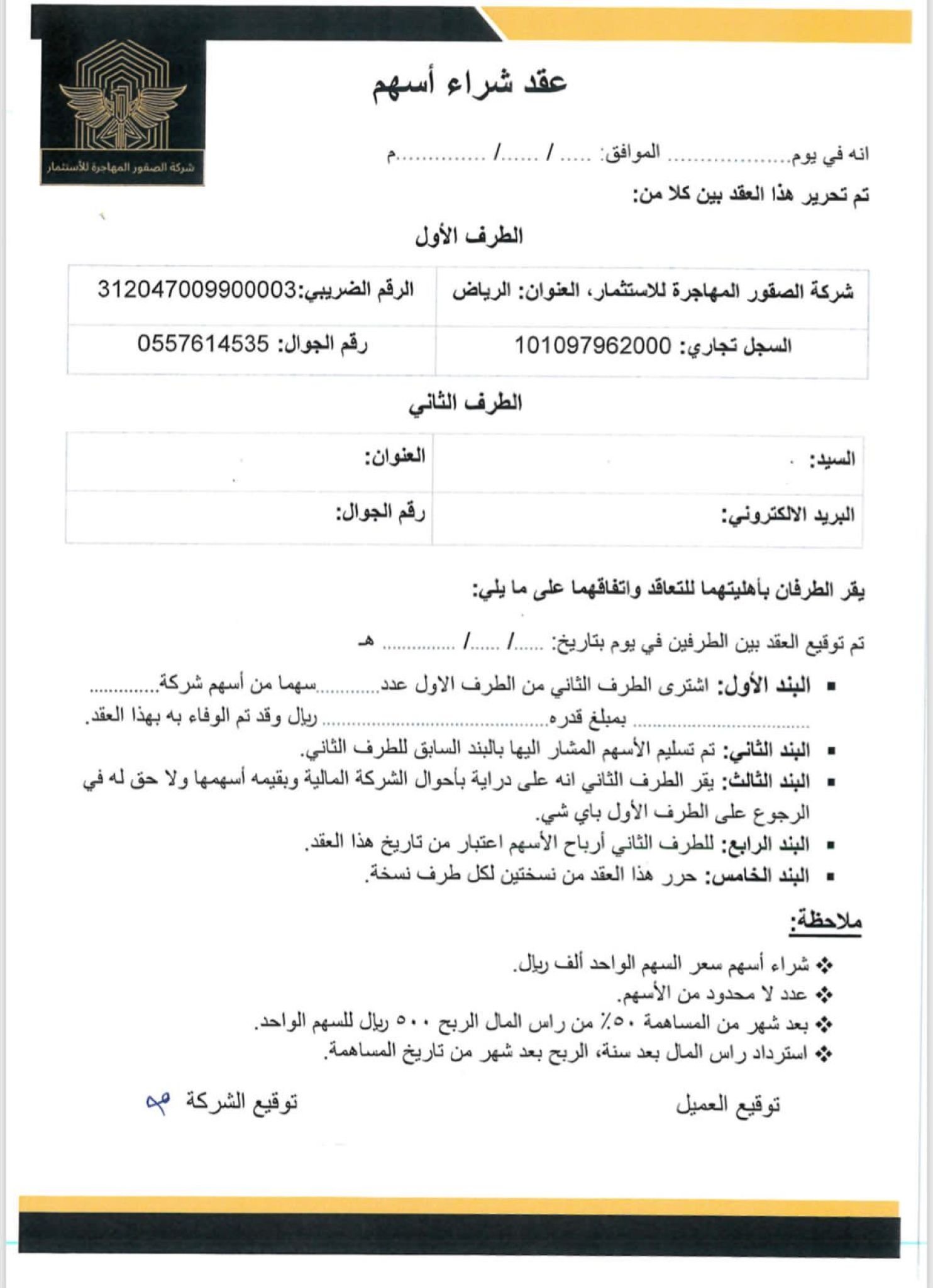 للمواطن والمقيم أعمال الشركه في الاستثمار والتطوير العقاري والاستيراد والتصدير وتم بحمد الله طرح أسهم شركة الصقور المهاجرة للإستثمار عدد لامحدود من الأسهم سعر سهم الواحد 1000ريال ويوجد عقد بين الشركه والمستثمر قبل الدفع نسبه الربح50٪ على السهم الواحد واستلام الربح بعد شهر من تاريخ العقد والدفع استرداد رأس المال بعد سنه والله الموفق https://alsu7qur.com/