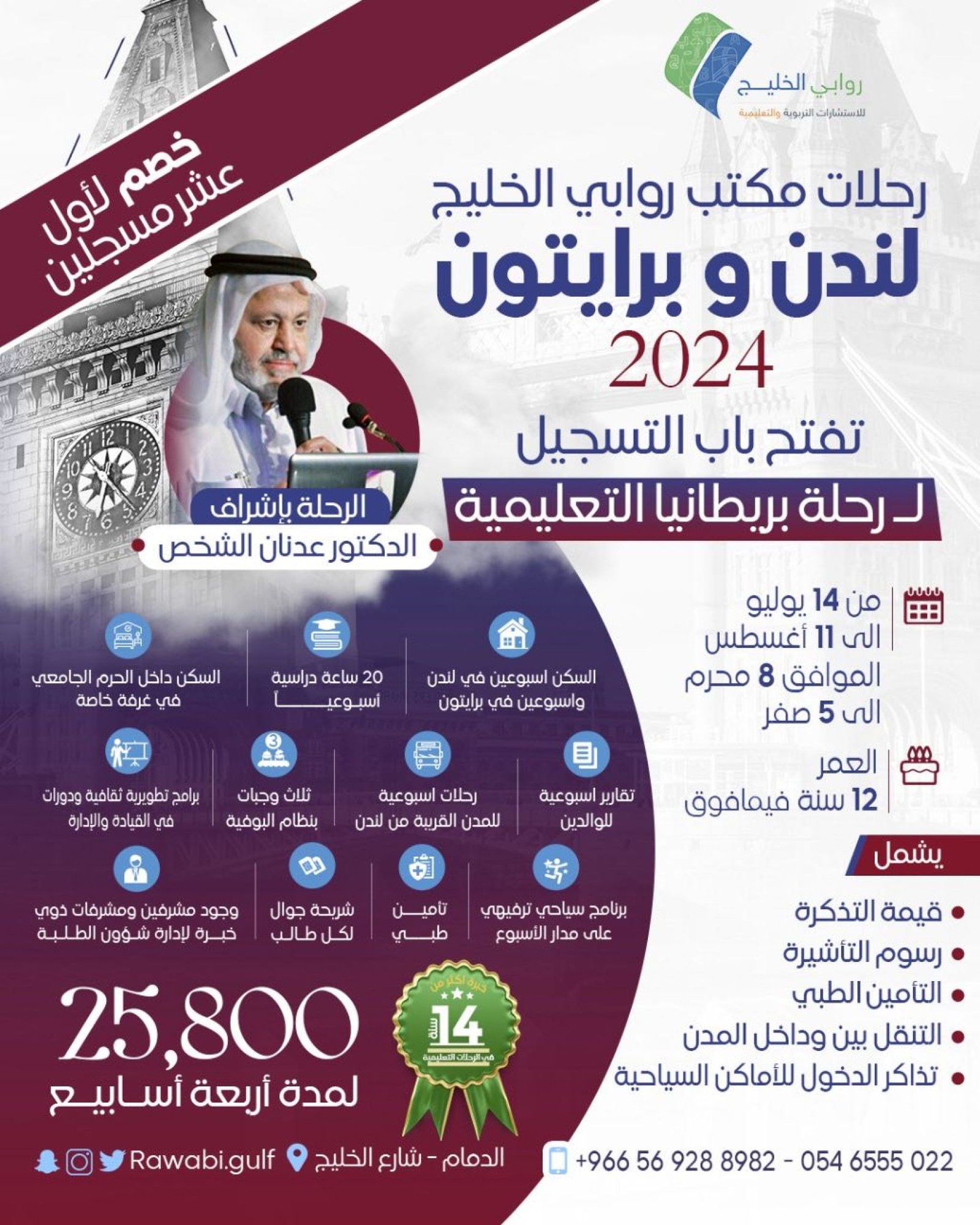 🇬🇧🇬🇧🇬🇧🇬🇧 *تجربة مُتفرده من التعليم الممتع لمُدة ٤ أسابيع* رحلات مكتب روابي الخليج *لندن و برايتون* تفتح باب التسجيل لـ *رحلة بريطانيا التعليمية* للذكور والإناث من عمر ١٢ سنة فما فوق.✈️✨👌🏻 *خبرة اكثر من ١٤ سنة في الرحلات التعليمية * 📆 تاريخ الرحلة من ١٤ جولاي الى ١١ اغسطس الموافق ٨ محرم الى ٥ صفر ✨ *مُميزات الرحلة!:* ✈️✨ -السكن اسبوعين في لندن واسبوعين في برايتون . - ٢٠ ساعة دراسية أسبوعياً. - السكن داخل الحرم الجامعي في غرفة خاصة. - توفير ثلاث وجبات بنظام البوفية. - برنامج سياحي ترفيهي على مدار الأسبوع. - رحلات اسبوعية للمدن القريبة من لندن . - مشرفين ومشرفات ذوي خبرة لإدارة شؤون الطلبة ومتابعة مستوى التحصيل الدراسي. - برامج تطويرية ثقافية ودورات في القيادة والإدارة. - تقارير اسبوعية للوالدين. - تأمين طبي. - شريحة جوال لكل طالب. *رسوم الرحلة* 💲🎒✨ *٢٥٨٠٠* ريال. لمدة ..✨ *اريعة أسابيع*📕✈️🤍 يشمل: قيمة التذكرة، رسوم التأشيرة، التأمين الطبي والتنقل بين وداخل المدن + تذاكر الدخول للأماكن السياحية. للإطلاع على تقاصيل اكثر https://linktr.ee/rawabigulf6 للتواصل والإستفسارات: https://api.whatsapp.com/send?phone=9660569288982 🏢الموقع: الدمام / شارع الخليج