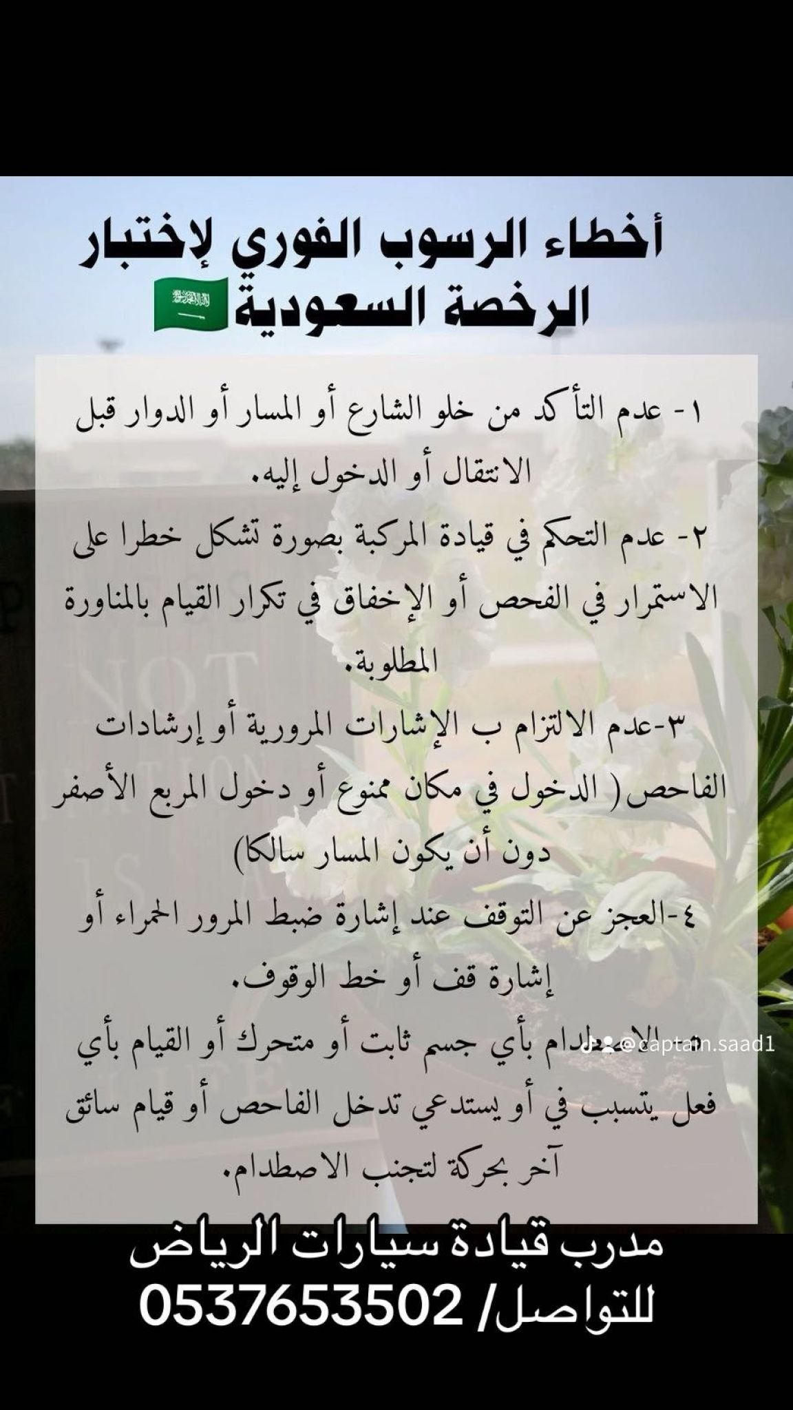 {{مدرب قيادة متقدمة خبرة طويلة لدى مدارس دلة ومدارس القيادة المتقدمة }} •••••••••••••••••••••••••••• {{A driving instructor who provides long experience at Dallah Schools and Advanced Driving Schools}} •••••••••••••••••••••••••• **تعليم قيادة السيارة من الصفر حتى الاتقان والاحتراف** **تهيئة المتدرب لإختبار الحصول على رخصة القيادة ** ** التدريب للرجال والنساء وكذلك السائقين الجدد** [التدريب على سيارة من نوع كامري موديل 2022] *********************************************** 1- تعليم أساسيات القيادة الامنه . 2-التدريب على مهارات القيادة. 3-تعليم القيادة في وسط الأحياء و الشوارع العامة. 4- التدريب على مهارة ركن السيارة والدخول والخروج للدوار و للطرق الرئيسية والتدريب على الدخول والخروج من المواقف. 5-تعليم مهارة الـX الاكس ومهارة ال S الموجوده بمدرسة تعليم القيادة اضافة للمهارات الاخرى. 6-التدريب باحترافية حتى الاتقان. [[لدينا الخبرة الكافية والمهارة في كسر حاجز الخوف لدى المتدرب في وقت وجيز]] ((التدريب عملي ونظري)) # يتم تزويد المتدرب بصور وفيديوهات وتعليمات على الواتس اب والمتابعة المستمرة وكذلك تزويده بمذكرة تعليم القيادة الامنة بمافي ذلك مايحتاجه في مدرسة القيادة واستخراج الرخصة.. الموقع /جميع احياء الرياض . مدة التدريب على حسب طلب ورغبة المتدرب:- مدة الحصة / ساعة ونص سعر الحصة / 200 ريال ((للرغبة التواصل على الرقم 👇👇واتس اب وسيتم الرد في اسرع وقت )) 👇 { ( 0537653502 ) }