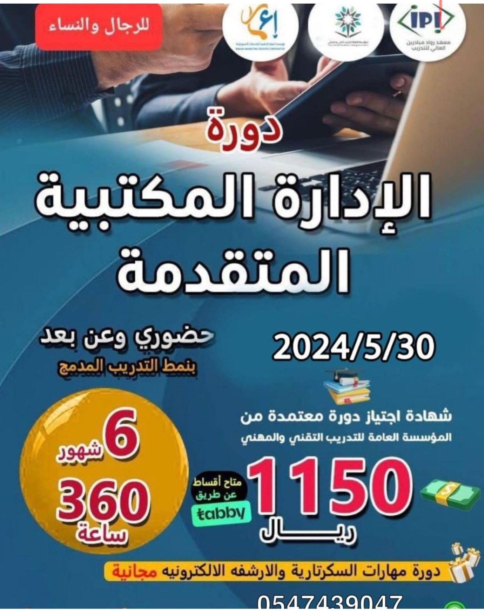 يسر مؤسسة إعمار للتسويق بالتعاون مع معهد رواد مبادرين للتدريب ان تقدم لكم 🗳الدورة الأكثر طلباً في سوق العمل دورة الإدارة المكتبية المتقدمة ♦️*معلومات الدورة*♦️ ♦️مدة الدورة : ٦ أشهر ⌚️ ٣٦٠ ساعة تدريبة 🗓 30 - 5 - 2024 م ⏰ ( اختياري ) صباحاً أو مساء - 3 أيام بالأسبوع 💰رسوم الدورة : 1150 ﷼ متاح دفع أقساط ميسرة عبر تابى ✅ *هدية الدورة*✅ دورة مهارات السكرتارية والأرشفة الاكترونيه مجانا. ♦️*مميزات الدورة*♦️ ♦️يحصل المتدرب على شهادة من المؤسسة العامة للتدريب المهني والتقني بعد اجتياز الاختبار. ♦️توفير الحقائب التدريبية. ♦️مرونة في أوقات التدريب. ♦️مطلوبة في جدارة ومعتمدة في القطاعات العسكرية والمدنية. ♦️ للرجال وللنساء. ——————————— 💳 لسداد الرسوم :- 📍المفاجأة متاح دفع أقساط ميسرة عبر تابى 4 دفعات 📍للدفع كاش حساب المؤسسة دفعة واحدة **※═══•❃✿❃•═══※ للتسجيل التواصل واتس اب👇🏼 0547439047