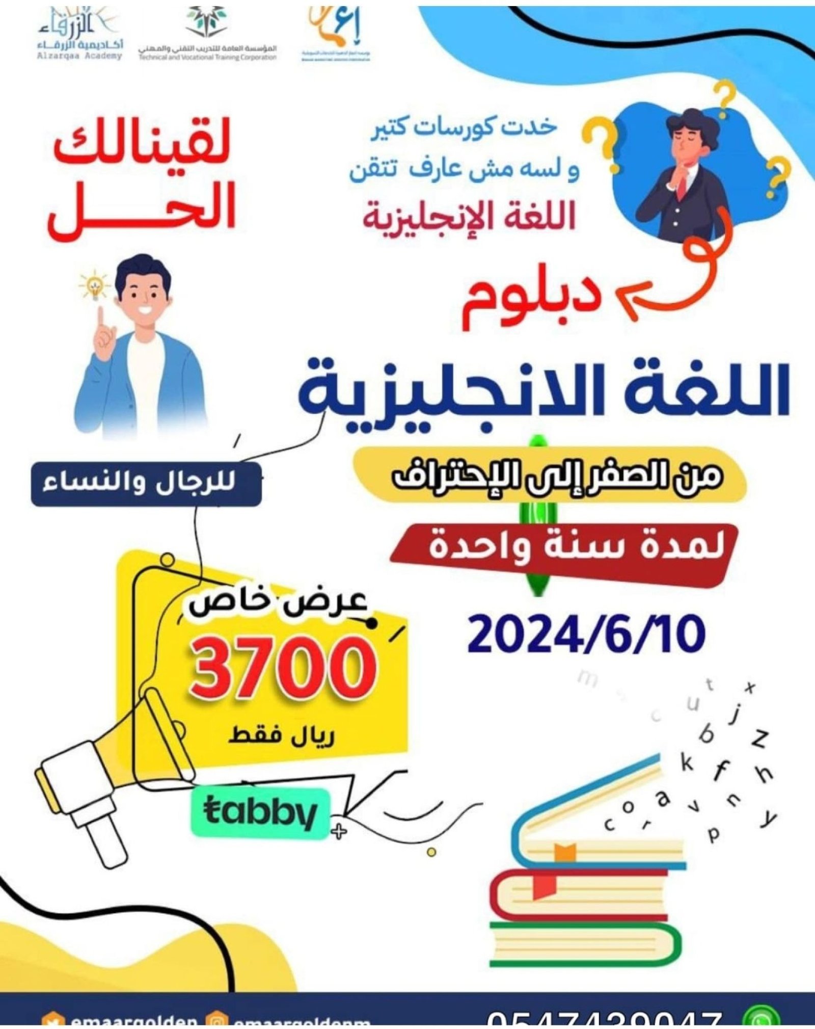 دبلوم اللغة الانجليزية من الصفر حتى الإحتراف معهد وأكاديمية الزرقاء العالي للتدريب بالتعاون مع مؤسسة إعمار للتسويق والتنسيق يقدمان 📍 دبلوم اللغة الانجليزية 📍 هو الخيار المثالي لك. سواء كنت تهتم بالسفر والثقافة أو الأعمال التجارية الدولية، فإن اللغة الصينية ستمنحك فرصًا لا حصر لها. 📍مدة الدبلوم : ١٢ شهر (سنة) 📍بمعدل : ٤٨٠ ساعة تدريبية ————————————- 🗓 التاريخ : 2024/6/10 📍التوقيت : الأوقات مرنه تختلف في كل مستوى وهي مسائية ———————————- عامة للكل: رجال _ نساء 💰رسومها: 3700 ريال فقط ———————————— ✅ المميزات ✅ ▪️شهادة معتمدة من الموسسه العامه للتدريب المهنى والتقني ▪️توفير الحقائب التدريبية. ▪️محاضرات مسجلة للرجوع إليها في أي وقت. ▪️الدورة شاملة لرسوم الشهادة والاختبار. ▪️مطلوبة في جدارة وفي القطاع الخاص والعام . ※═══•❃✿❃•═══※ 📍المفاجأة متاح دفع أقساط ميسرة عبر تابى للتسجيل التواصل واتس اب👇🏼 0547439047